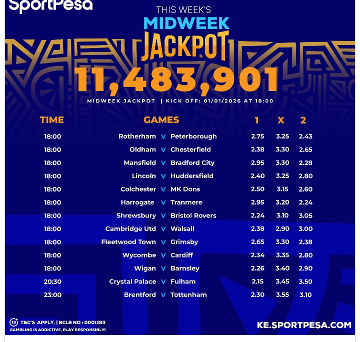 Sportpesa Midweek JP predictions: Playing on Thursday, 01/01/2026: The first Jackpot in 2026! Win possible 11.4 M