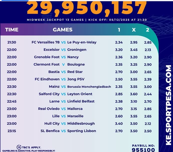 Sportpesa Midweek JP predictions: Playing on Friday, 05/12/2025 Under 5 hours: Win 29.9 M
