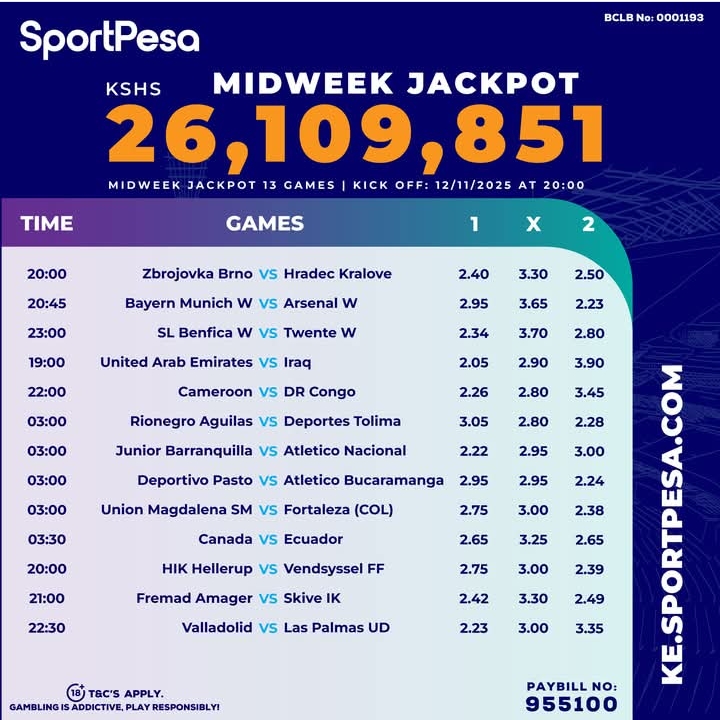 Sportpesa Midweek Jackpot results for 14/11/2025 Tayari: Kes. 137,290 was WON!!