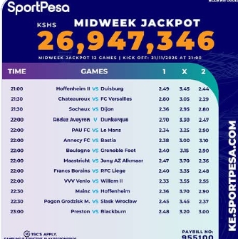 Sportpesa Midweek JP predictions: Playing on Friday, 21/11/2025 Under 5 hours!! Win 26.9 M
