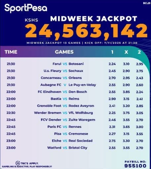 Sportpesa Midweek JP predictions: Playing on Friday, 07/11/2025. Win 24.5 M
