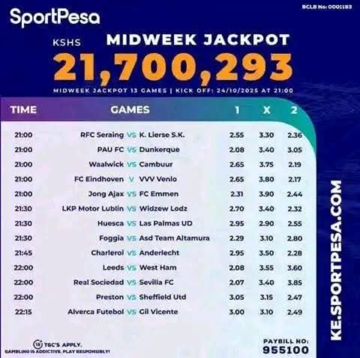 Congratulations! Sportpesa Midweek Jackpot result and bonuses for 24/10/2025 — Ksh 2,025,301 bonus WON