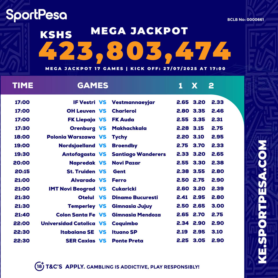 Win Ksh 423.8 M from 27/07/2025! We have prepared best predictions which stands bonus chances.