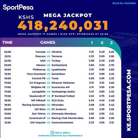Win Ksh 418.2 M From 07/06/2025! We have the best predictions. We've well analyzed Sportpesa Mega JP.