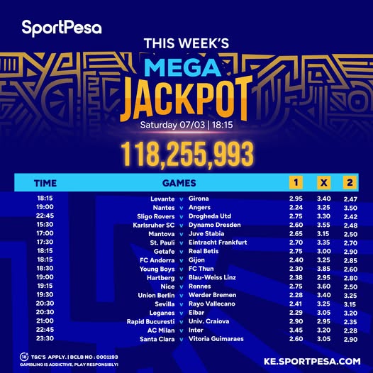 Sportpesa Mega Games & Predictions: Ksh 118.2 M up for grabs From Saturday 07/03/2026