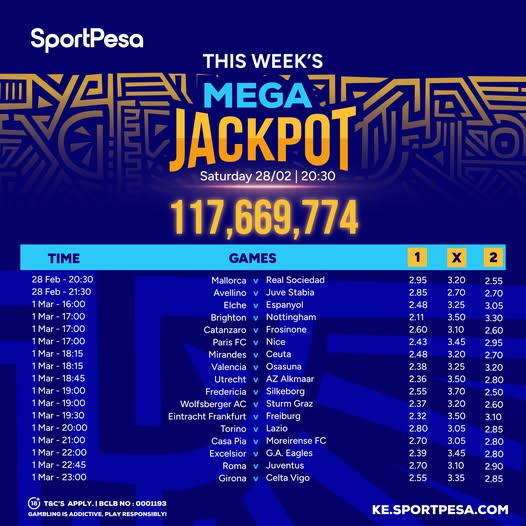 Sportpesa Mega Games & Predictions: Ksh 117.6 M up for grabs From Saturday 28/02/2026