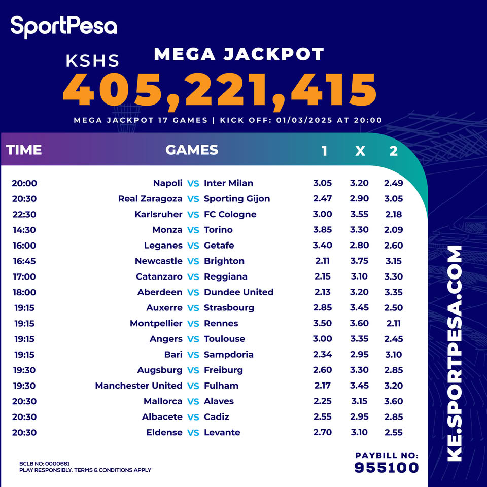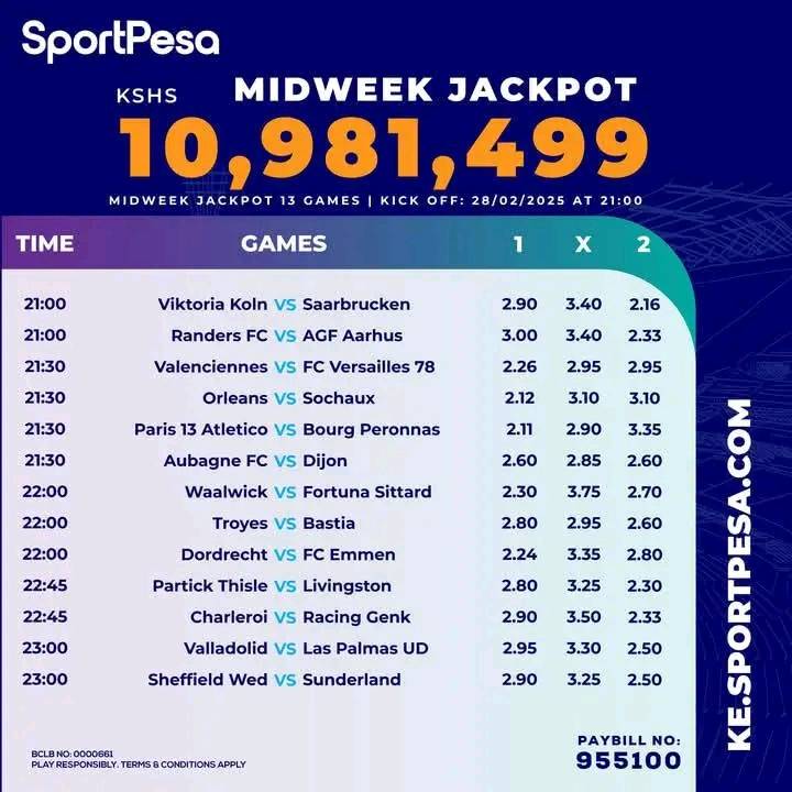 YES! YES! Sportpesa Midweek Jackpot results for 28/02/2025: Kes. 1,953,317 was WON!!