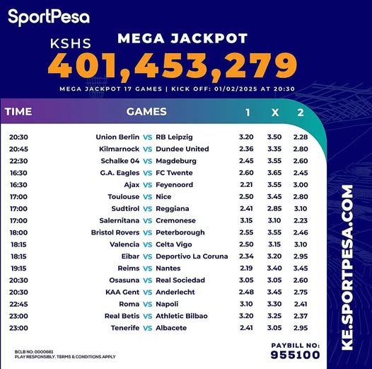Sportpesa Mega Jackpot result and bonuses for Mega JP 02/02/2025— kes. 2,931,804 was won!