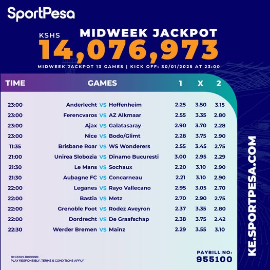We have REVISED our rates downwards! Win Ksh 14 M or juicy bonus in sportpesa midweek playing from: 30/01/2025