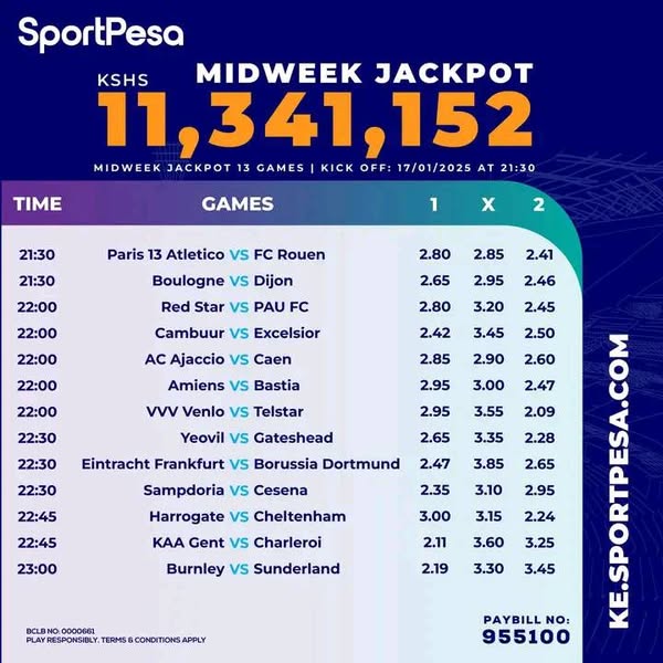 Win Ksh 11.3 M or juicy bonus in sportpesa midweek playing on FRIDAY: 17/01/2025