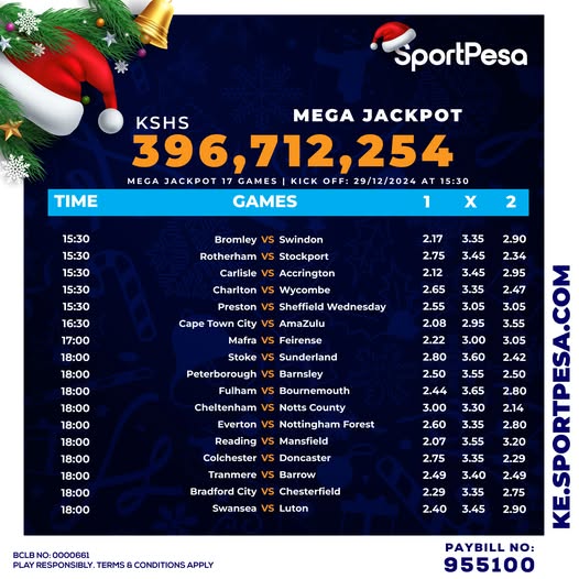 Sportpesa Mega Jackpot result and bonuses for Mega JP 29/12/2024— Ksh 1,079,986 bonus WON!