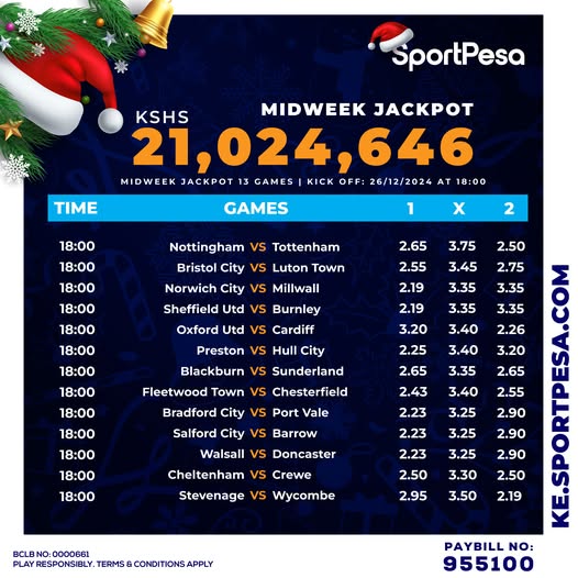 Win Ksh 21 M or juicy bonus in sportpesa midweek playing on: 26/12/2024