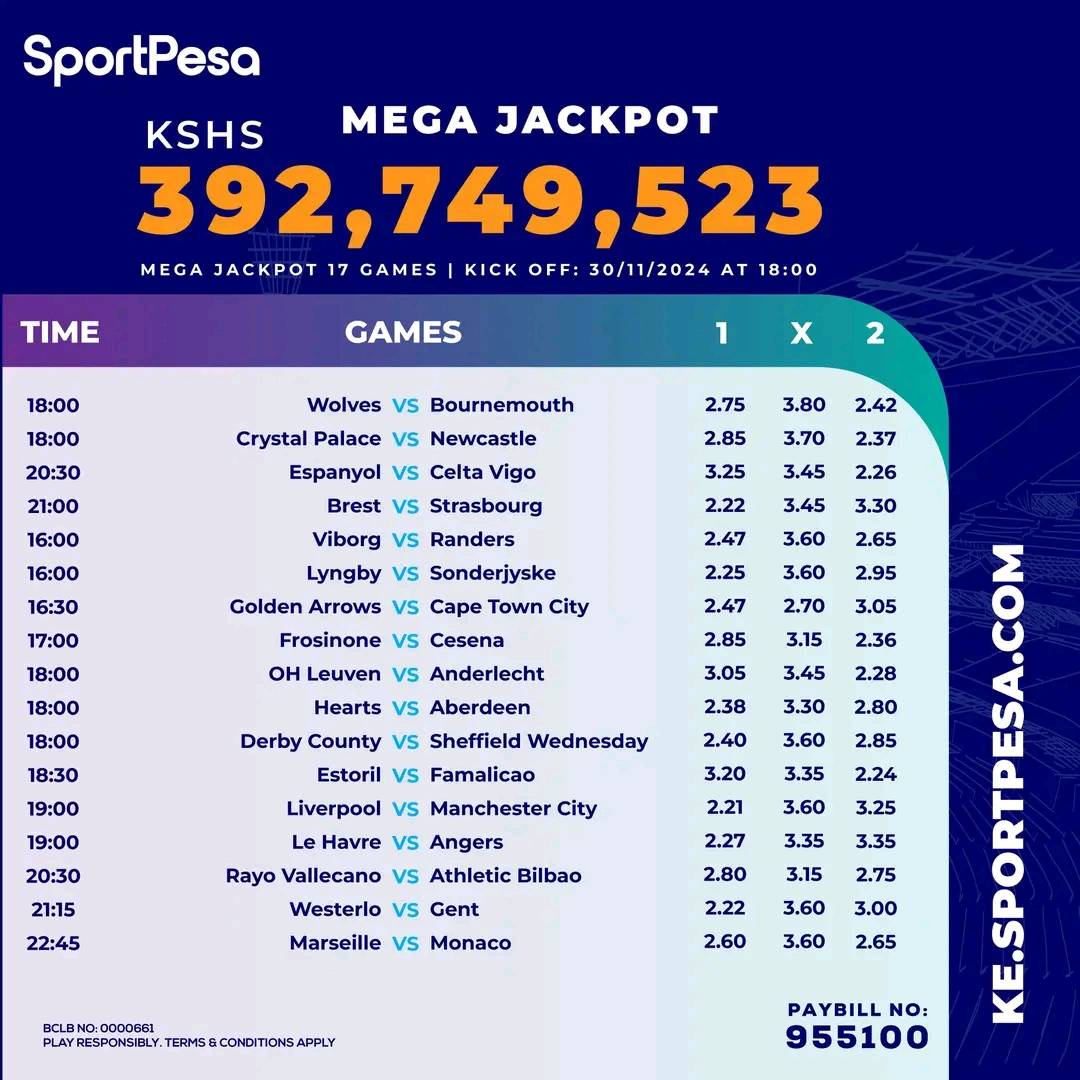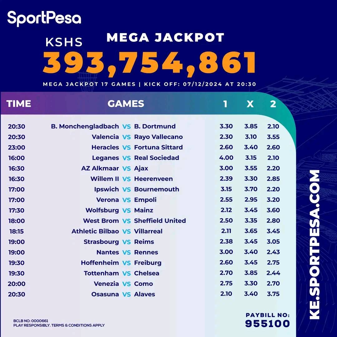Win Ksh 393.7 M or Juicy bonus from sportpesa Mega JP. Our versions must hit bonus mark on the least!