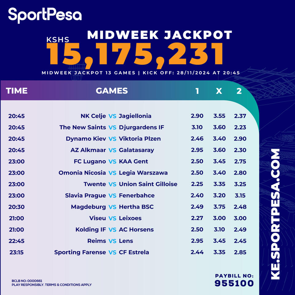Win Ksh 15 M or juicy bonus in sportpesa midweek playing on Friday: 28/11/2024