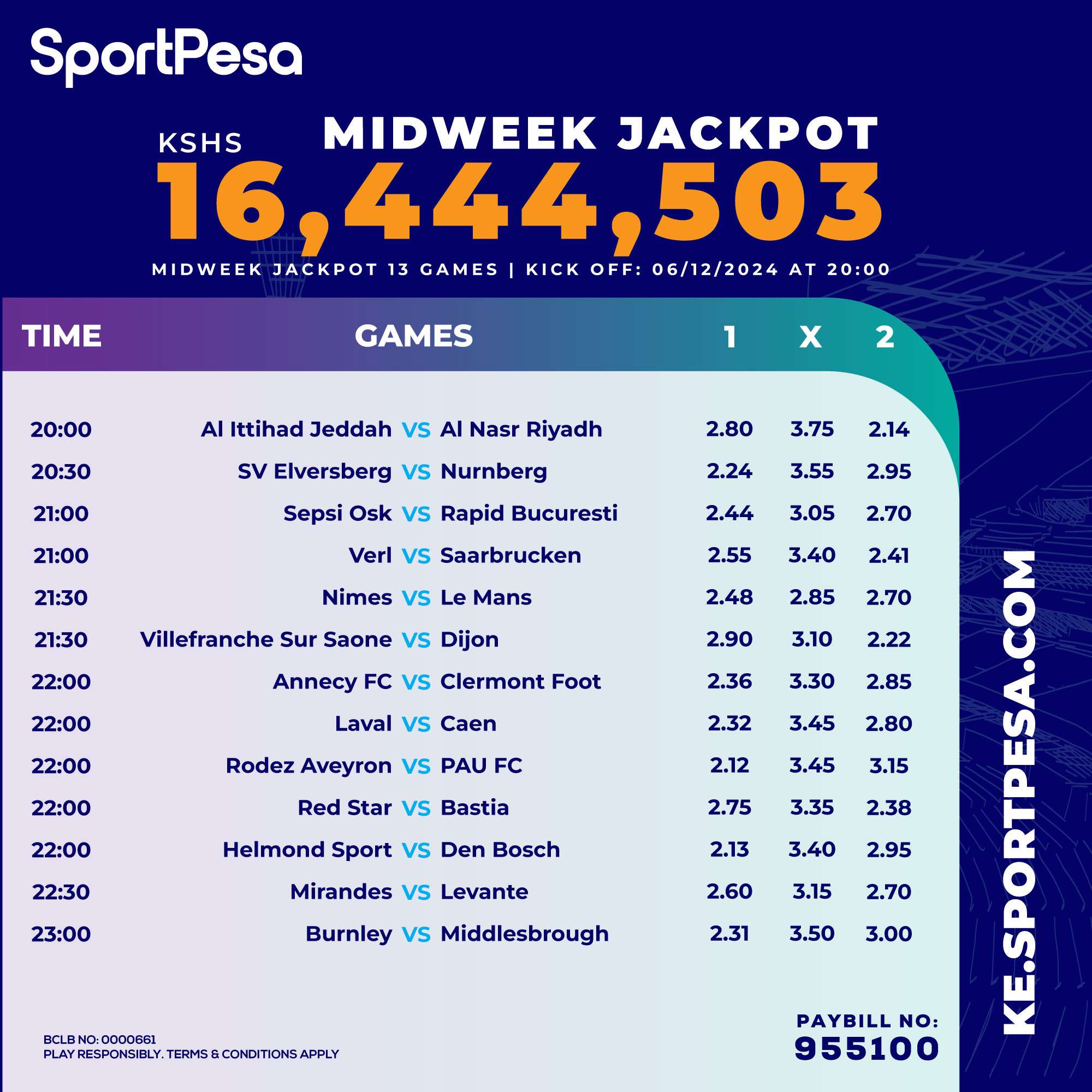 Win Ksh 16 M or juicy bonus in sportpesa midweek playing on Friday: 06/12/2024