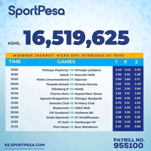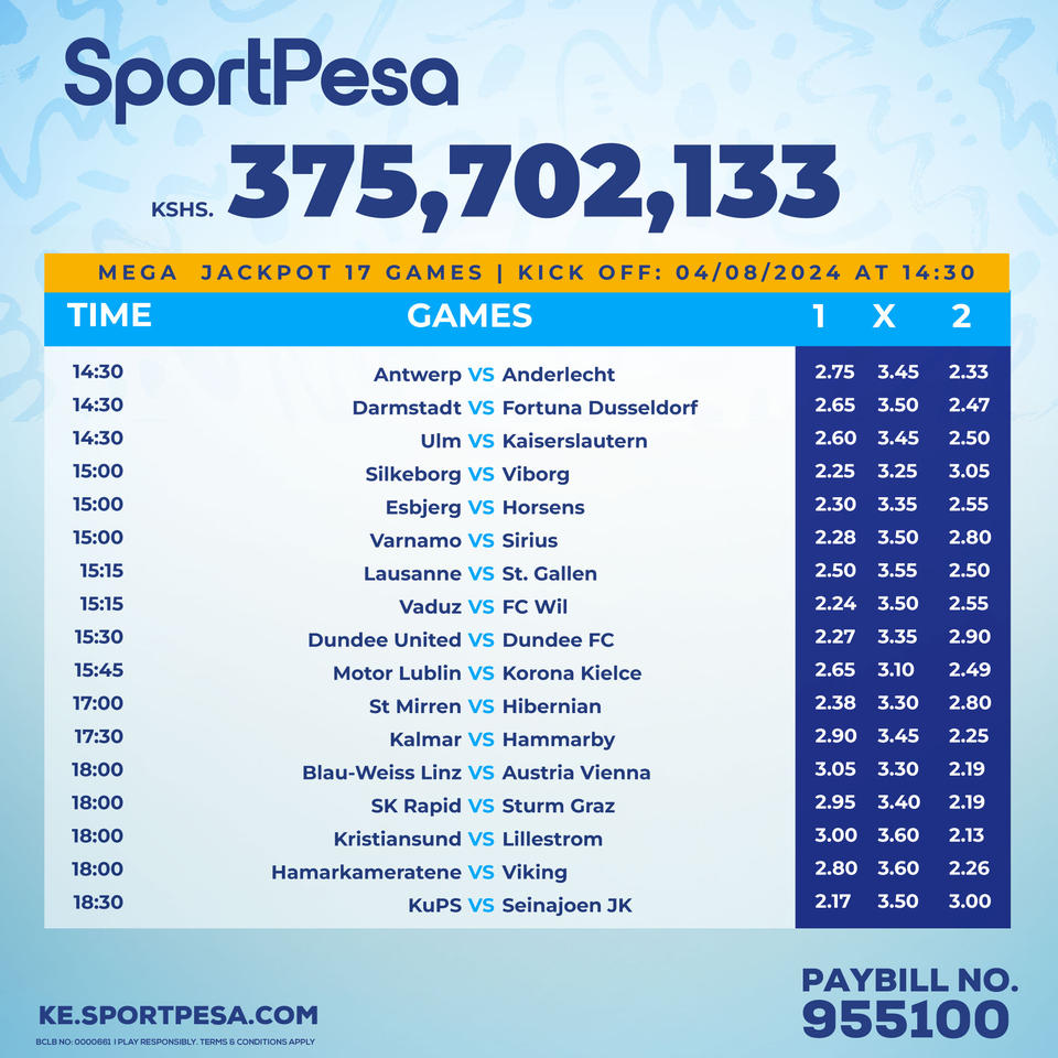 Sportpesa Mega Jackpot Predictions (MJP) playing today on Sunday: 04/08/2024: Win Ksh 375.7M