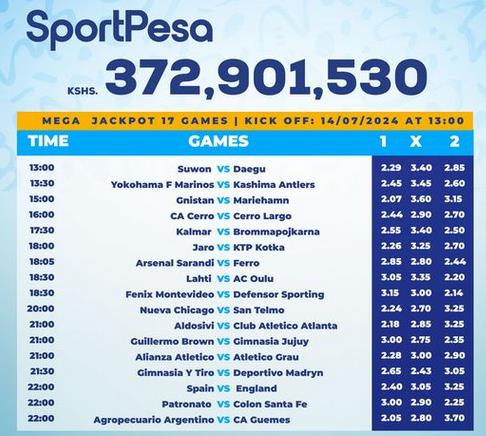 Sportpesa Mega Jackpot Predictions (MJP) playing today on: 14/07/2024: Win Ksh 372.9M