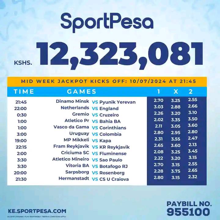 Win Ksh 12.3M or juicy bonus in sportpesa midweek playing on: 10/07/2024