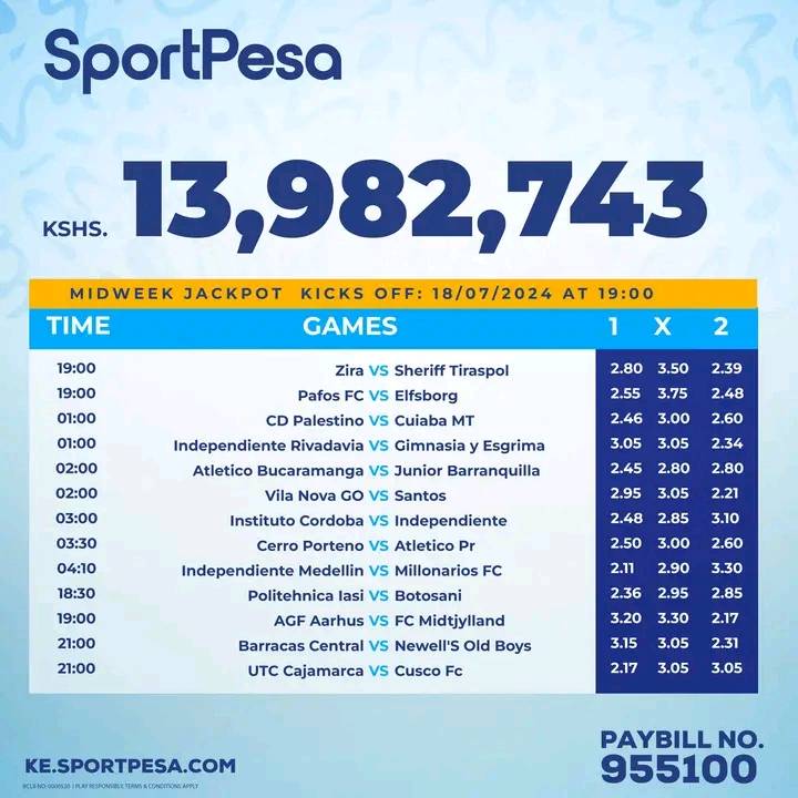 Win Ksh 13.9M or juicy bonus in sportpesa midweek playing on: 18/07/2024