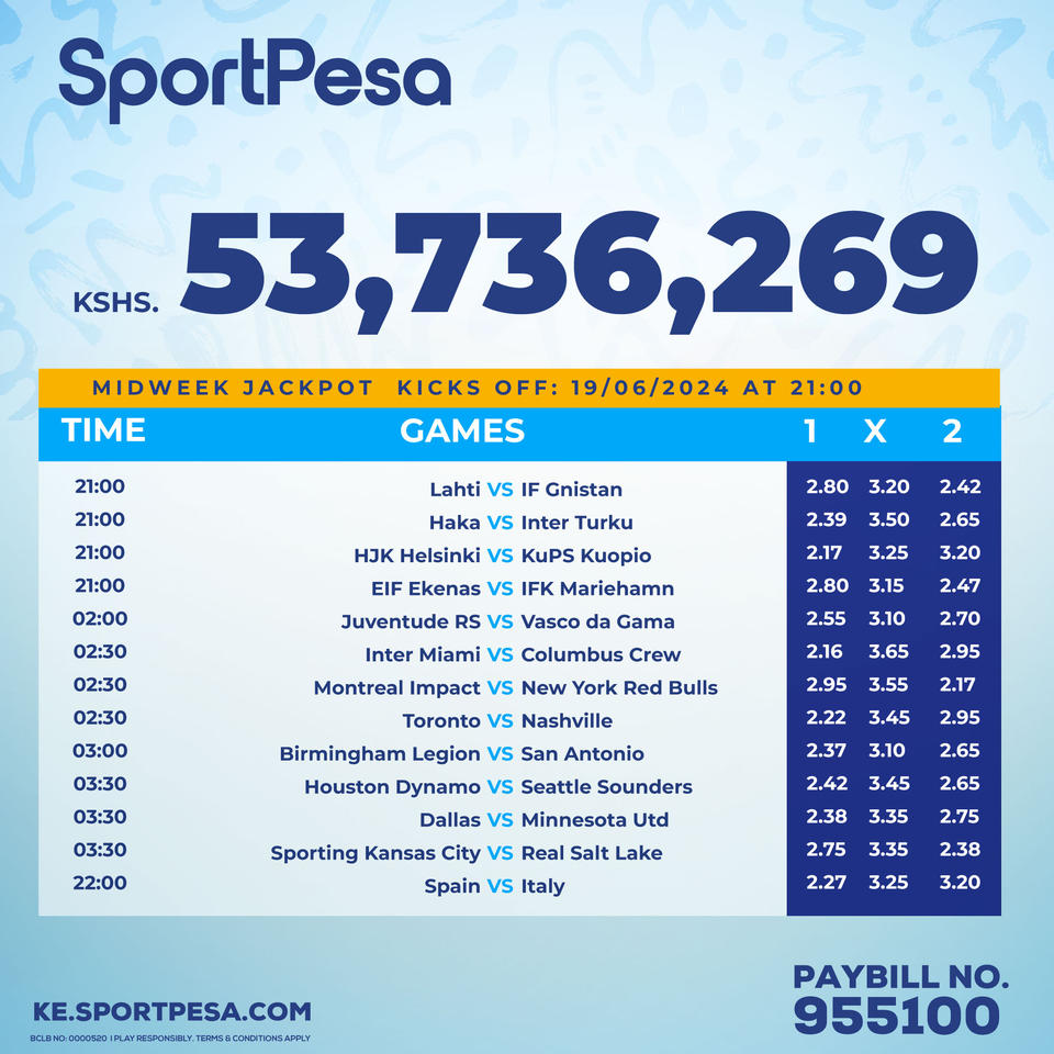 Win Ksh 53.7M or juicy bonus in sportpesa midweek playing ON: 19/06/2024
