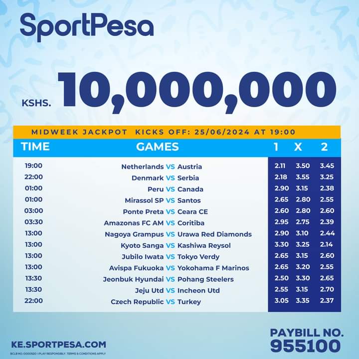 Win Ksh 10M or juicy bonus in sportpesa midweek playing Today: 25/06/2024