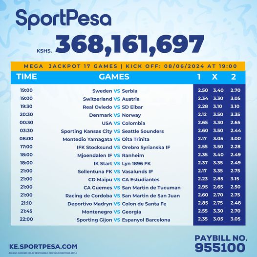 Sportpesa Mega Jackpot Predictions (MJP) playing Saturday on: 08/06/2024: Win Ksh 368.16M
