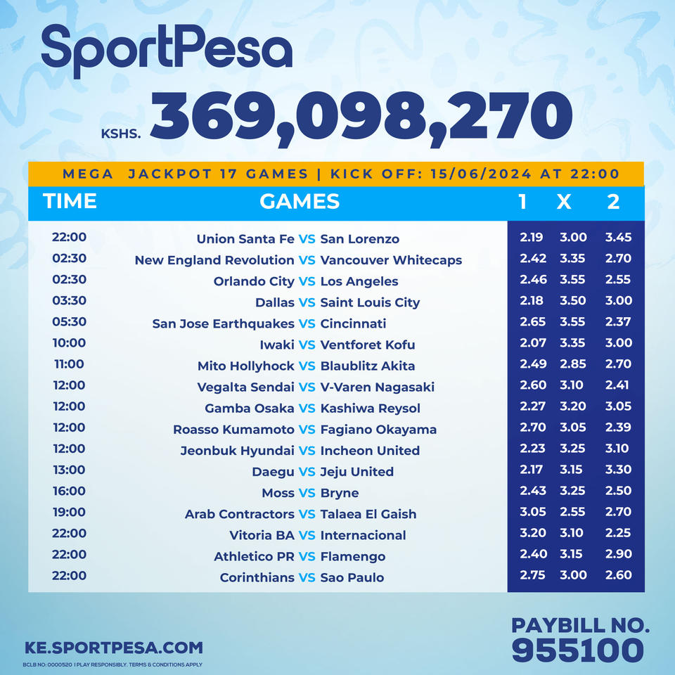 Sportpesa Mega Jackpot Predictions (MJP) playing Saturday on: 15/06/2024: Win Ksh 369M