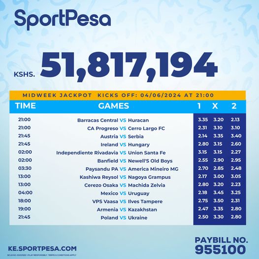 Win Ksh 52.8M or juicy bonus in sportpesa midweek playing from Tomorrow: 11/06/2024