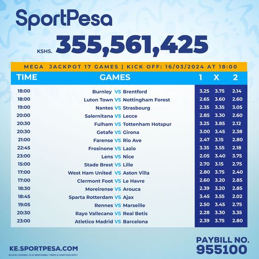 Sportpesa Mega Jackpot Predictions (MJP) for this weekend, 16/03/2023: Win Ksh 355.561M