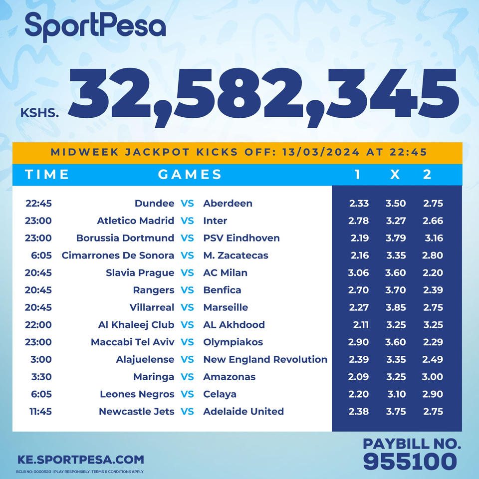 Sportpesa Midweek Jackpot for this week: 13/03/2024: Win Ksh 32.582M