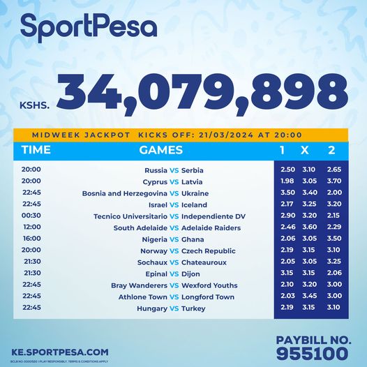 Sportpesa Midweek Jackpot for this week: 21/03/2024: Win Ksh 34.079M