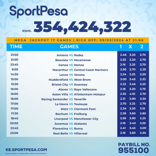 Sportpesa Mega Jackpot Predictions (MJP) for this weekend, 09/03/2023: Win Ksh 354.424M