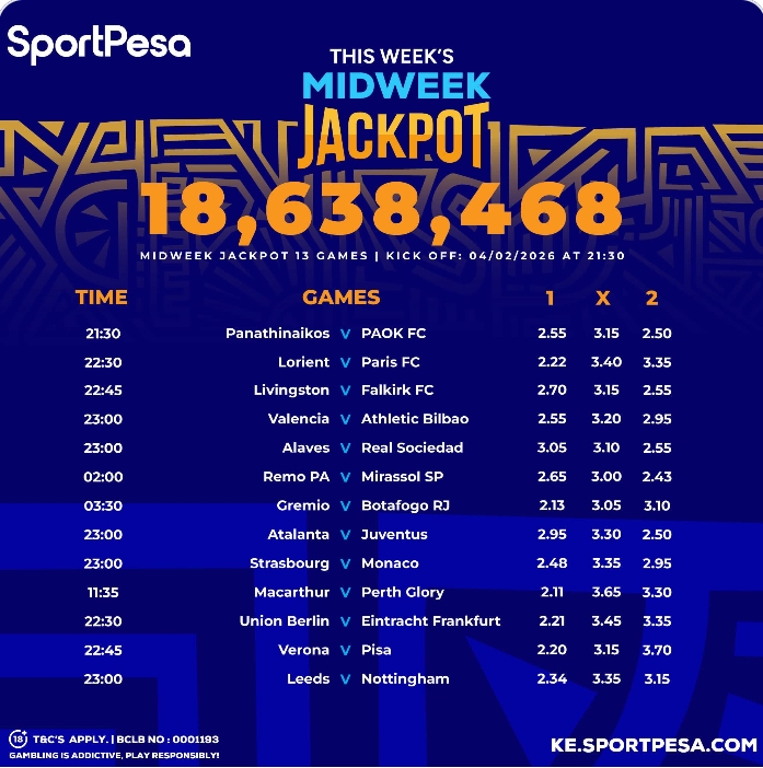 Sportpesa Midweek JP predictions: Playing from Wednesday, 04/02/2026: Win Kes.18.6 M