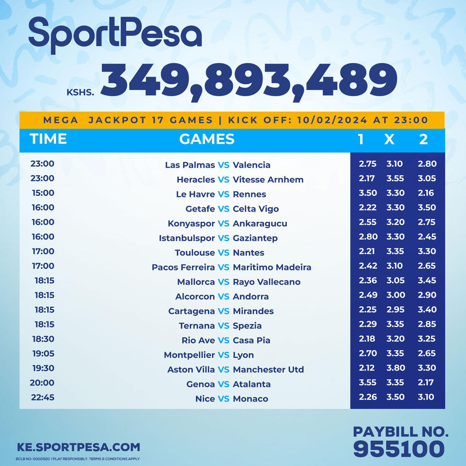 Sportpesa Mega Jackpot Predictions (MJP) for this weekend, 10/02/2023: Win Ksh 349.893M