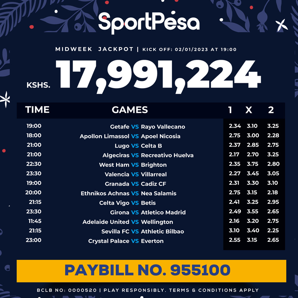Sportpesa Midweek Jackpot for this week: 02/01/2024: Win Ksh 17.991M