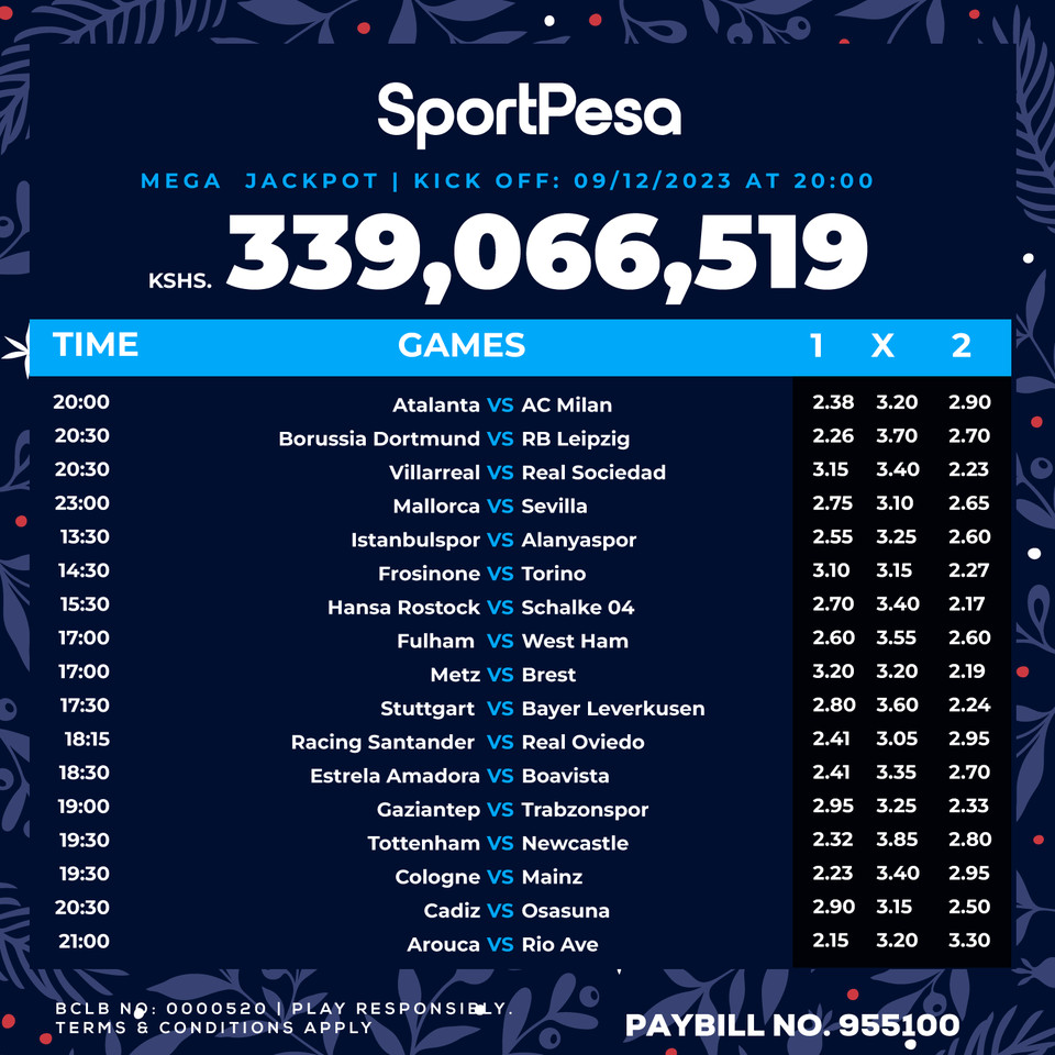 Sportpesa Mega Jackpot Predictions (MJP) for this weekend, 09/12/2023: Win Ksh 339.006M