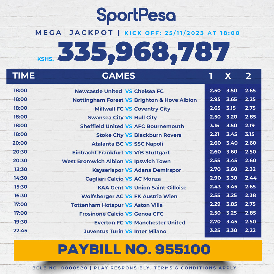 Accurate Sportpesa Mega Jackpot Predictions (MJP) for this weekend, 25/11/2023: Win Ksh 335.968M